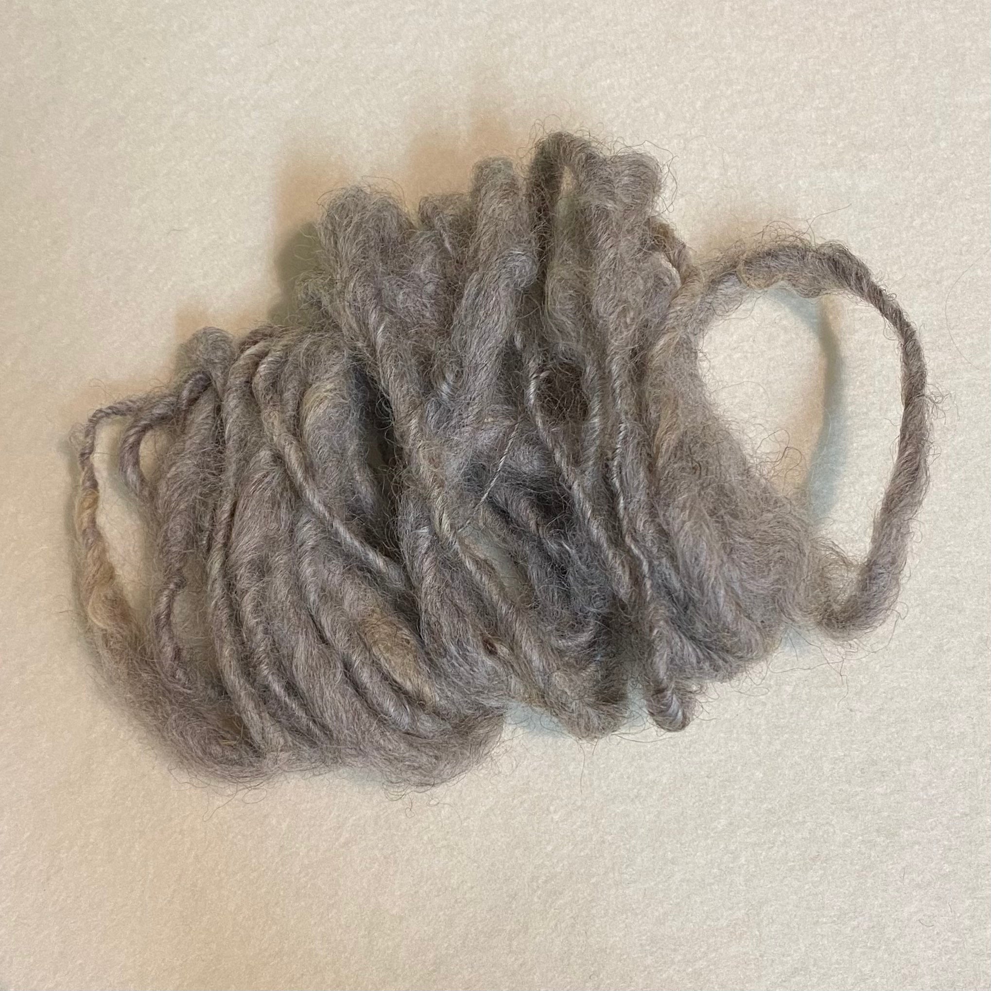 I also have available in small quantities hand spun natural grey English Leicester that I use for dolls hair.